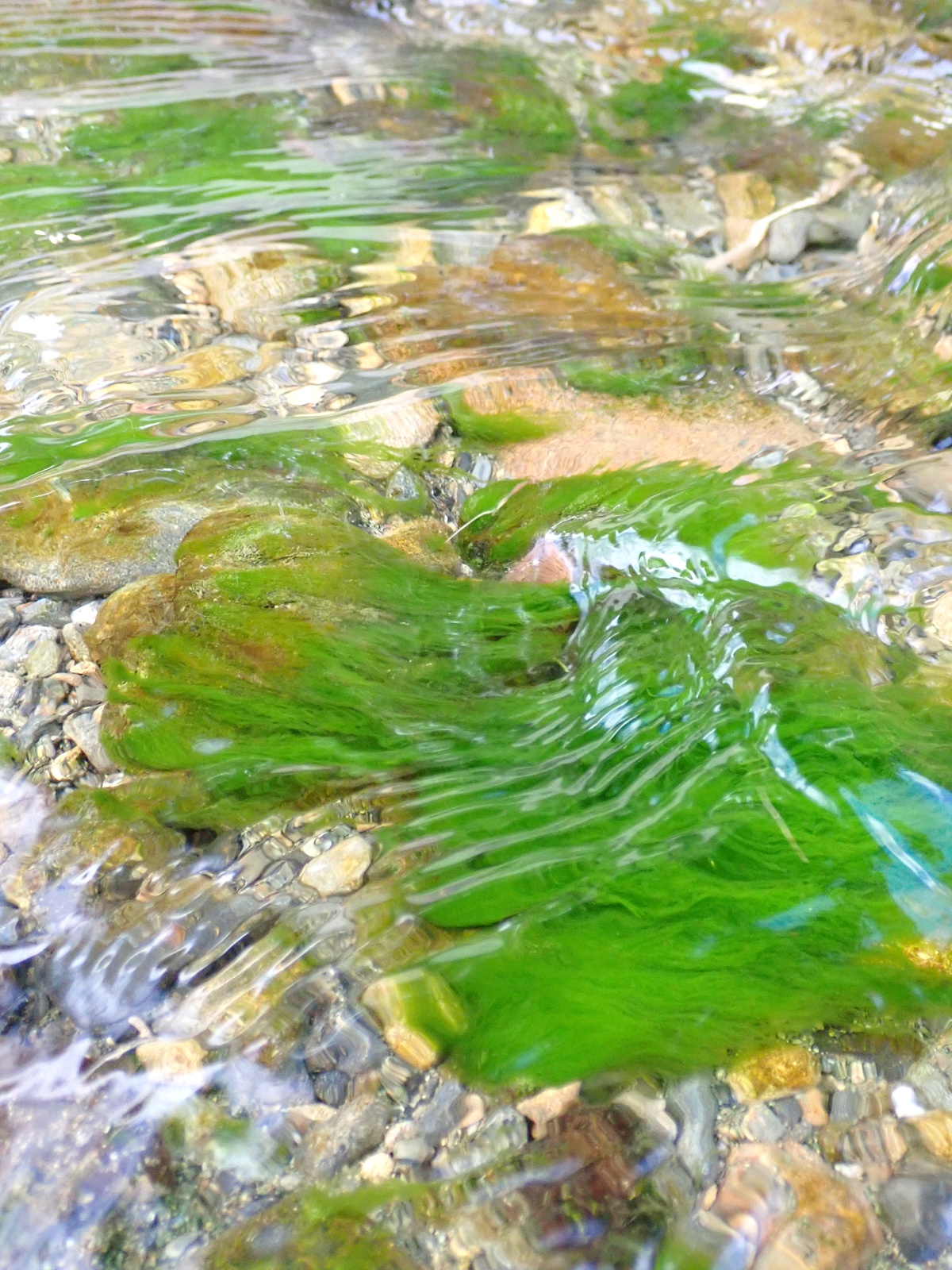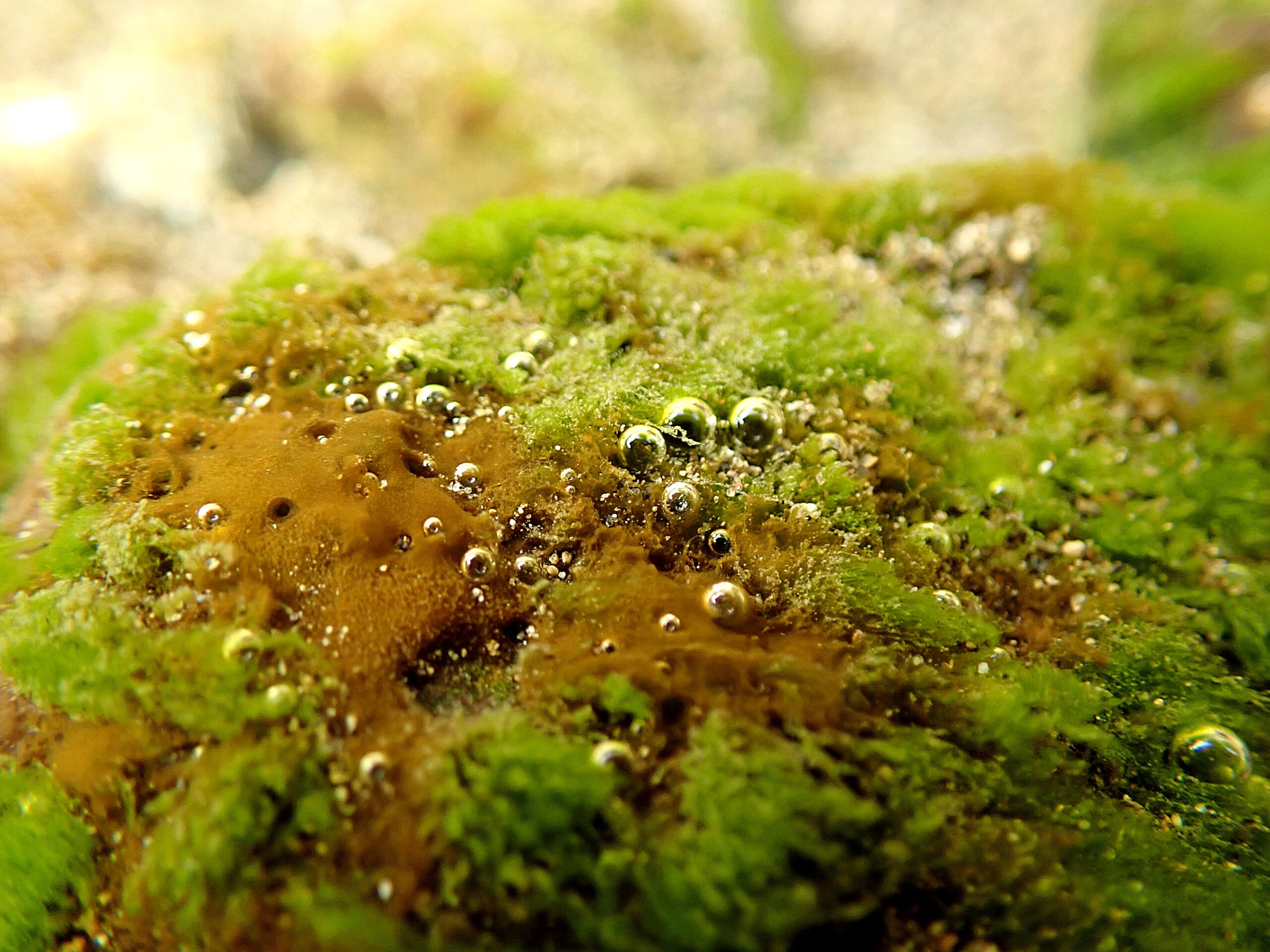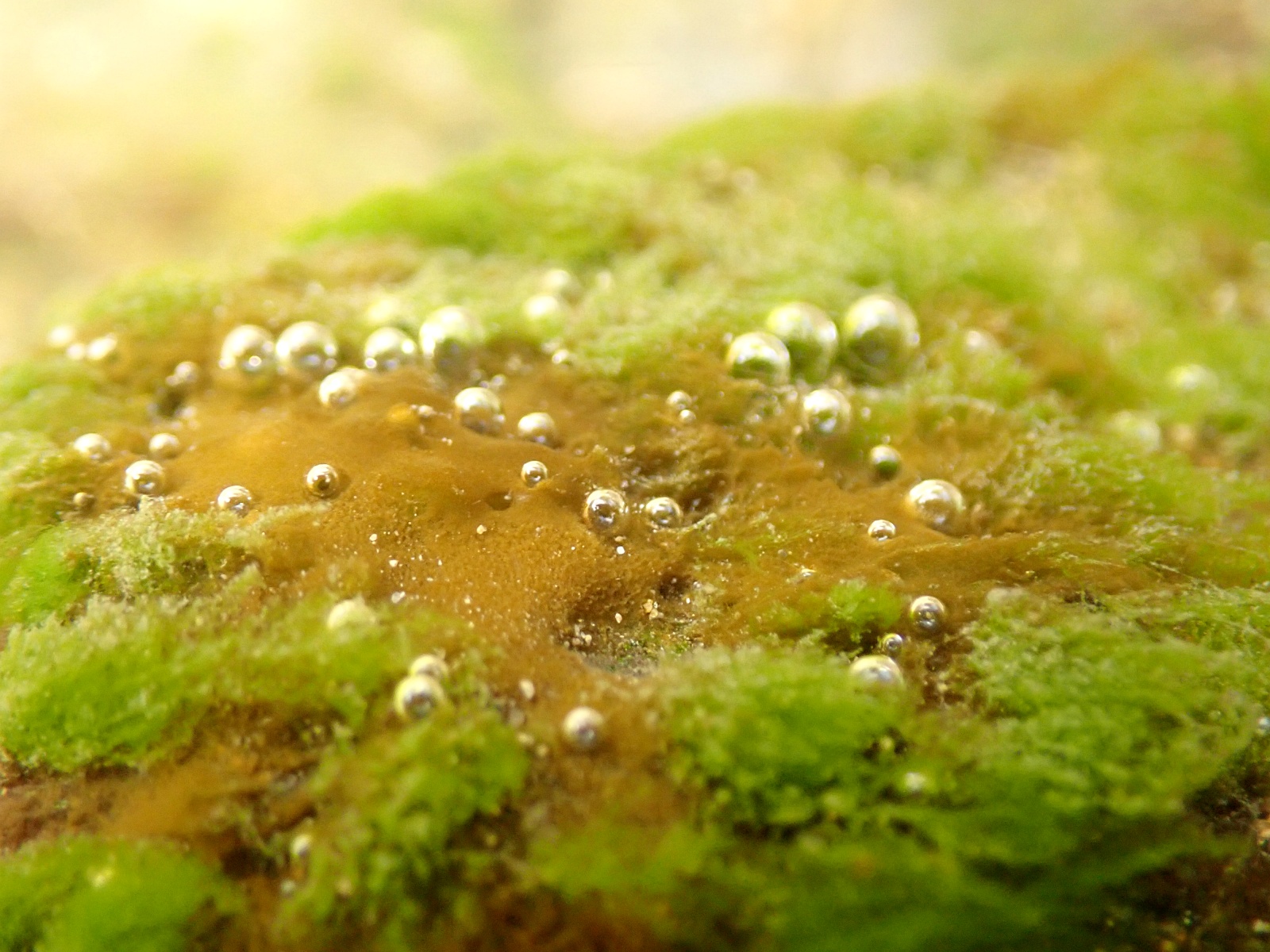 小川の中の苔のついた石に、たくさんの気泡。