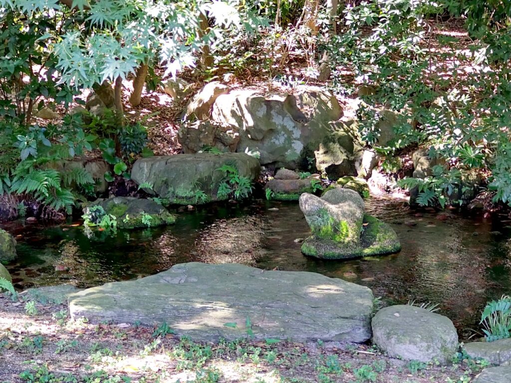 紫雲山のふもとに広がる広大な敷地には和船での遊覧を行えるほど大きな池があり、池に流れ込む小川も随所に見られます。