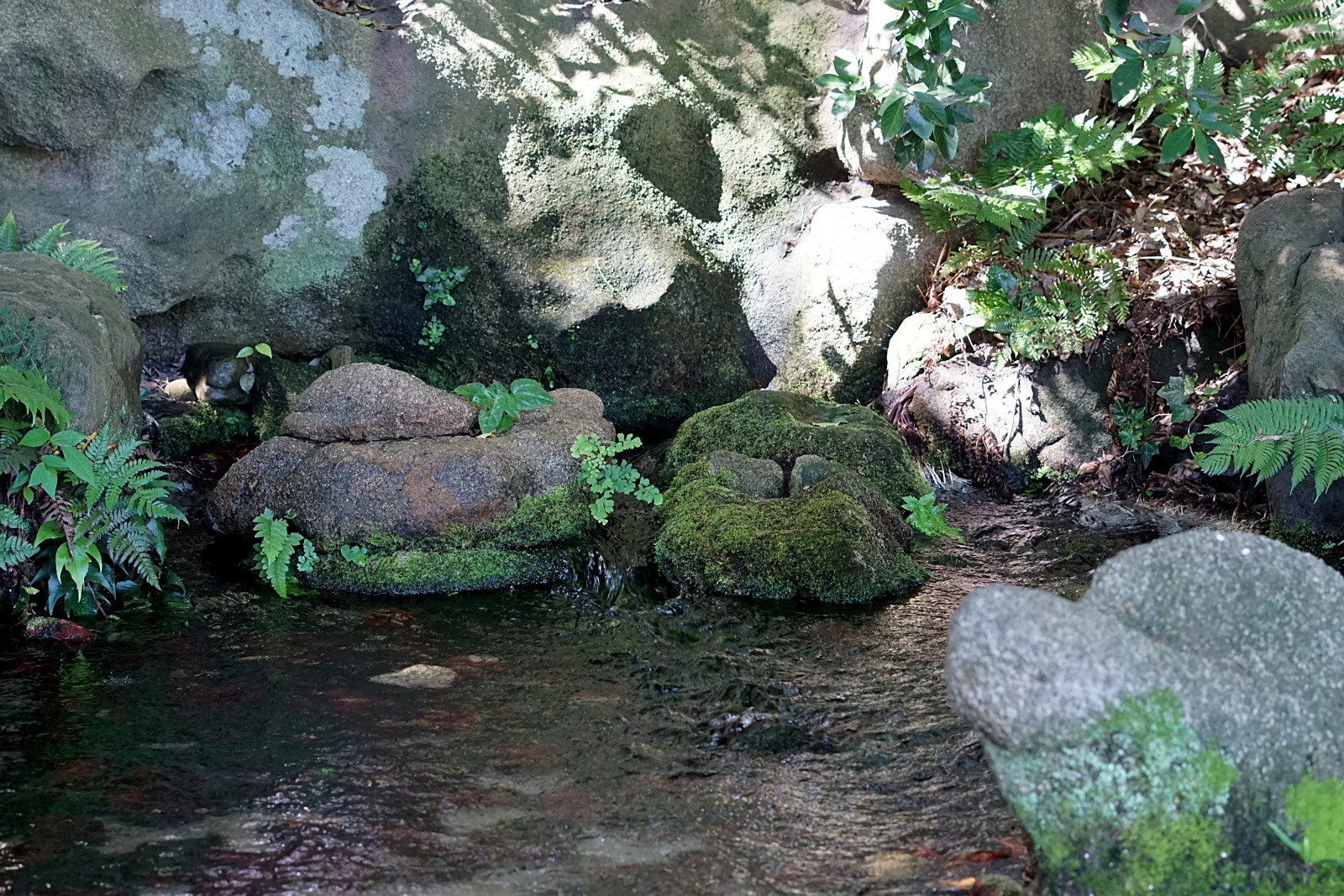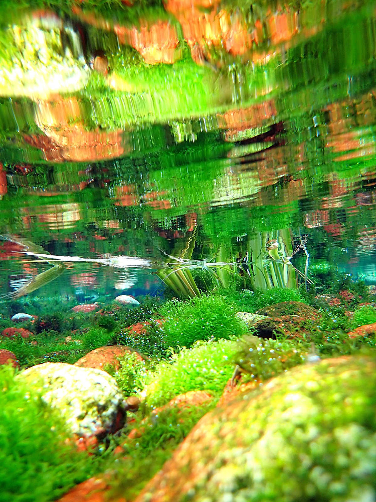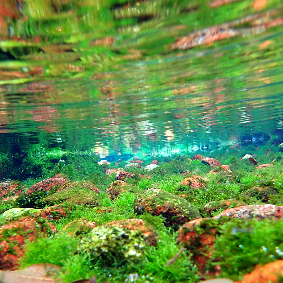 湧き出たばかりの水が流れ出る場所では、赤い石と緑の水苔の色彩のコントラストが美しいです。