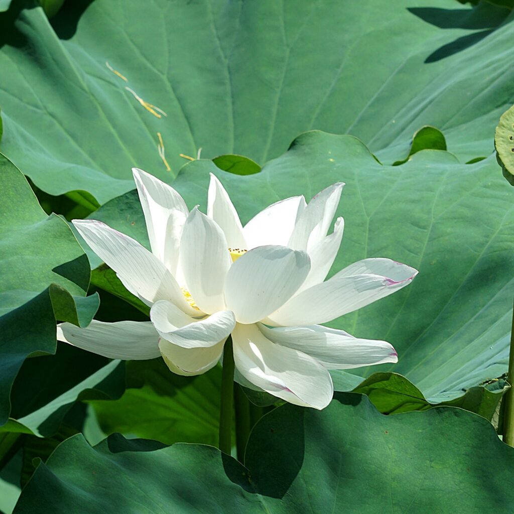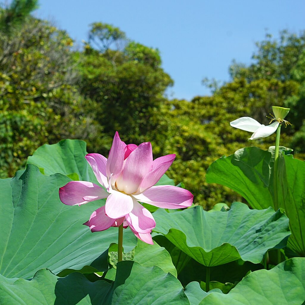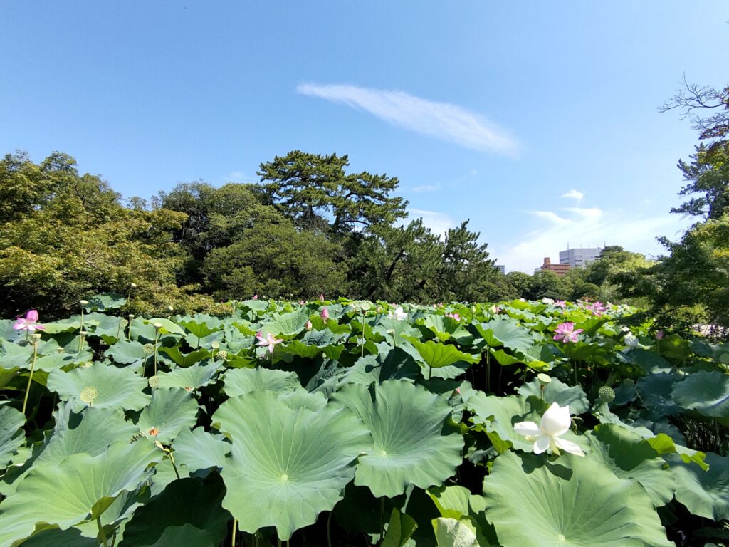 芙蓉沼(ふようしょう)。こちらも六大水局の一つ。青空を背景に蓮が咲く極楽浄土のような風景が広がります…。