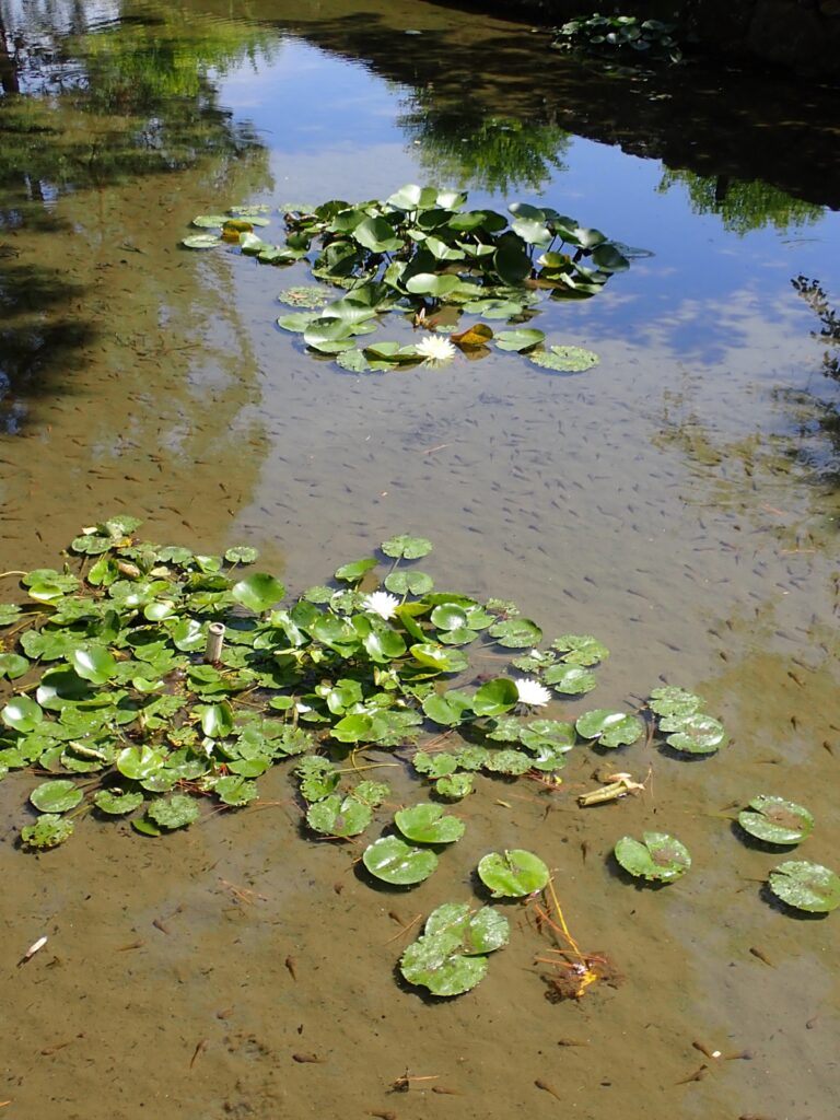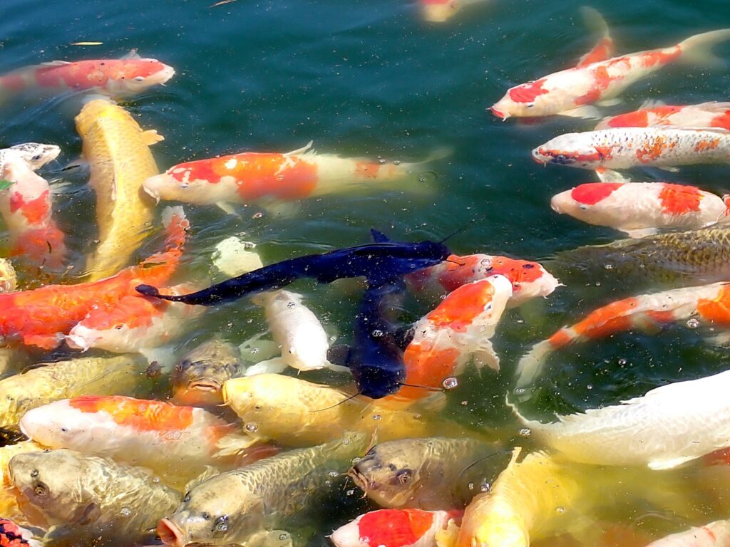 水が流れ込む近くの池では、たくさんの錦鯉がいて、売店で購入した餌をあげることができます。