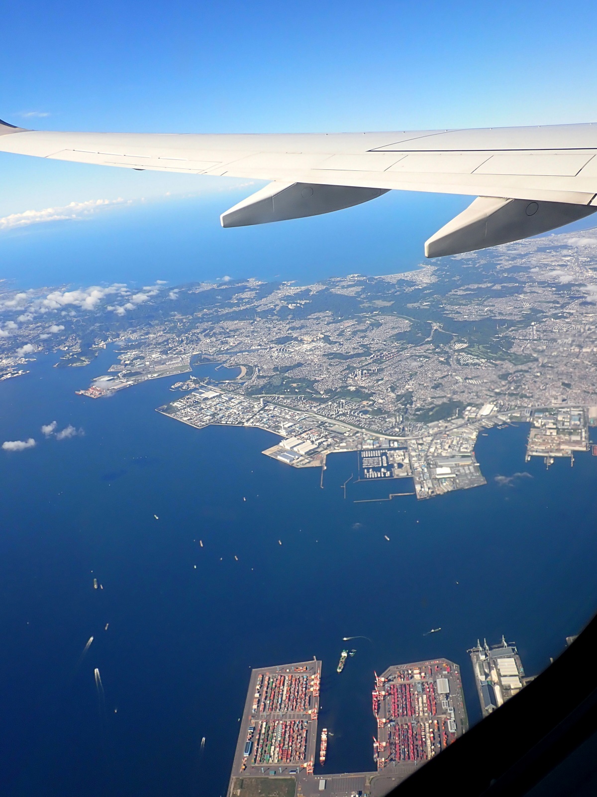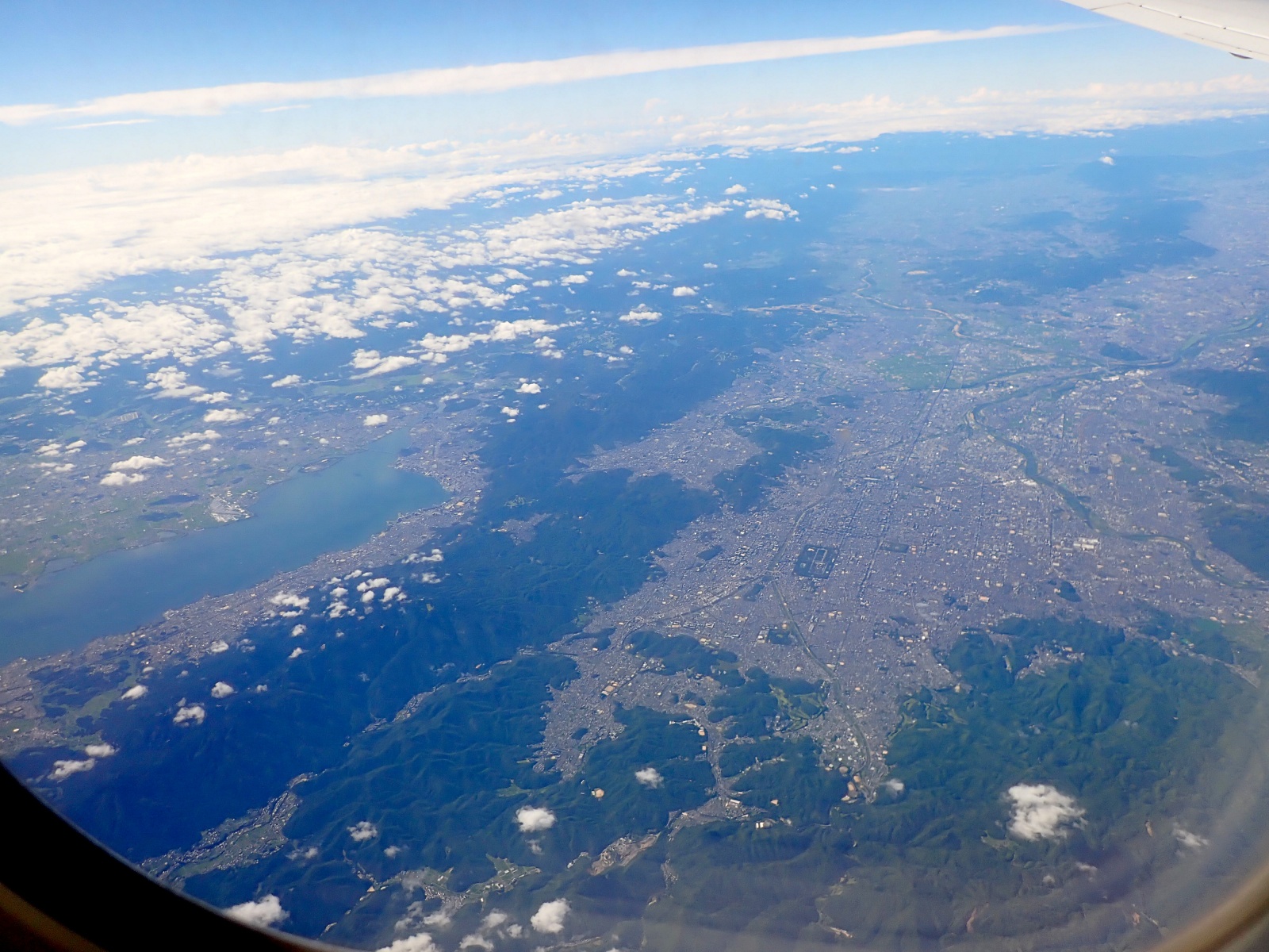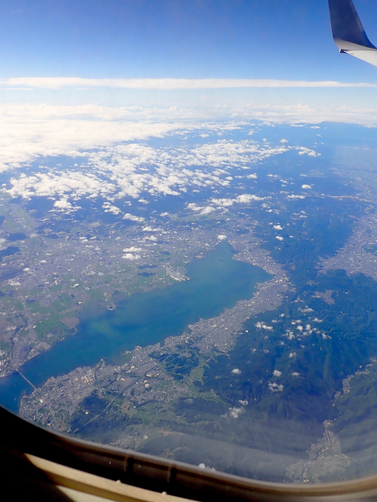 眼下に広がった巨大な湖。去年訪れた琵琶湖です!地上からでもその大きさに圧倒されましたが、空から見ると改めて「日本一の湖」であることを実感しますね(一瞬、湾だと思いました)。