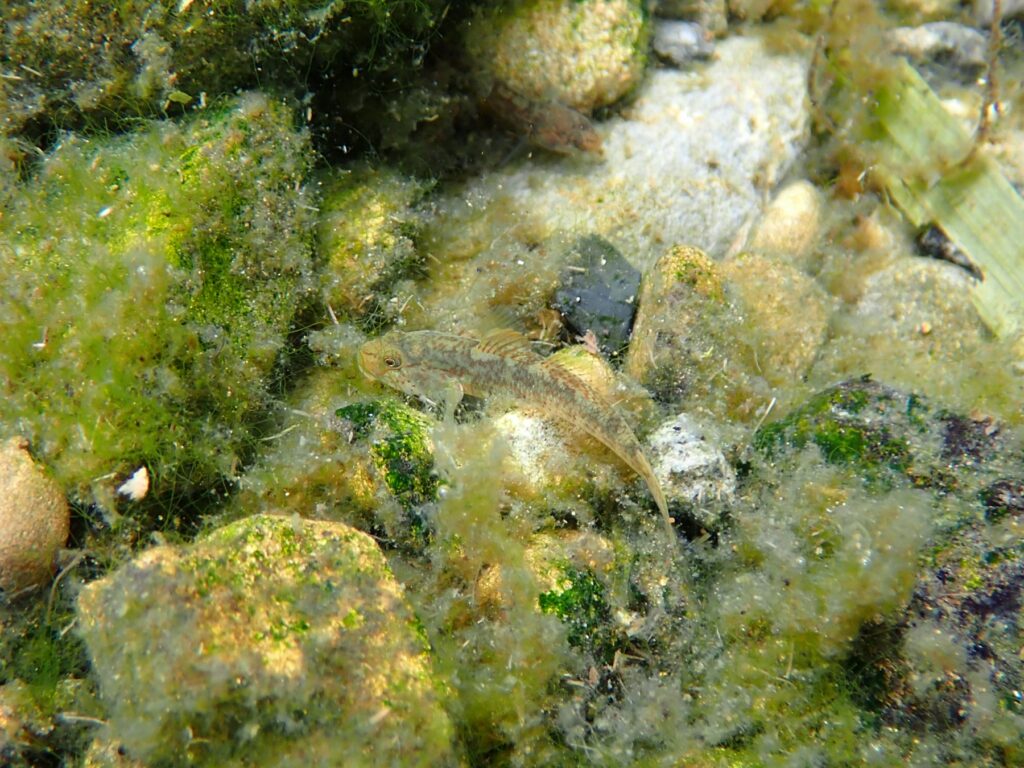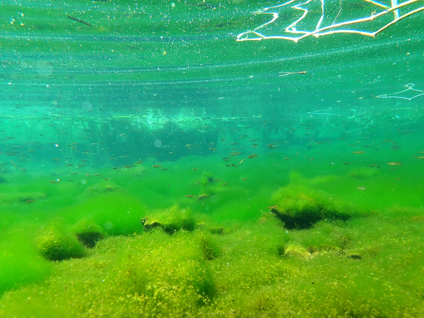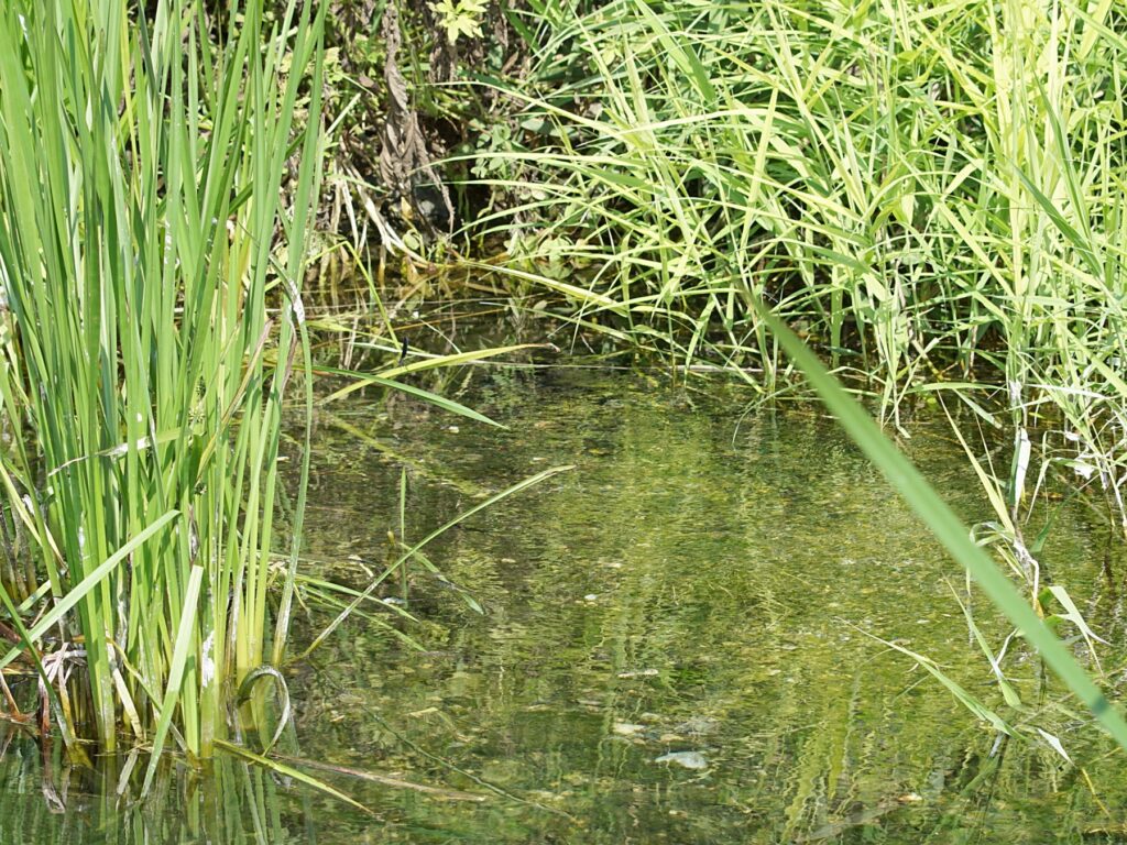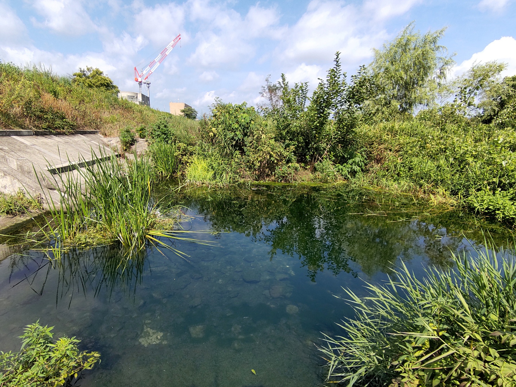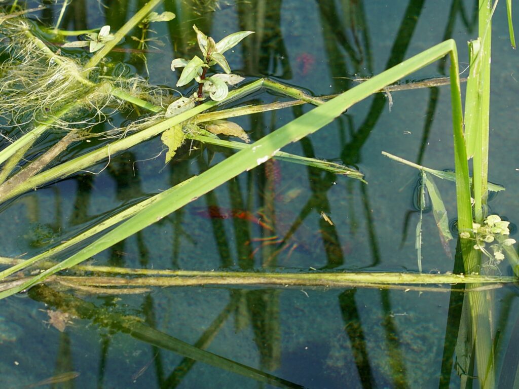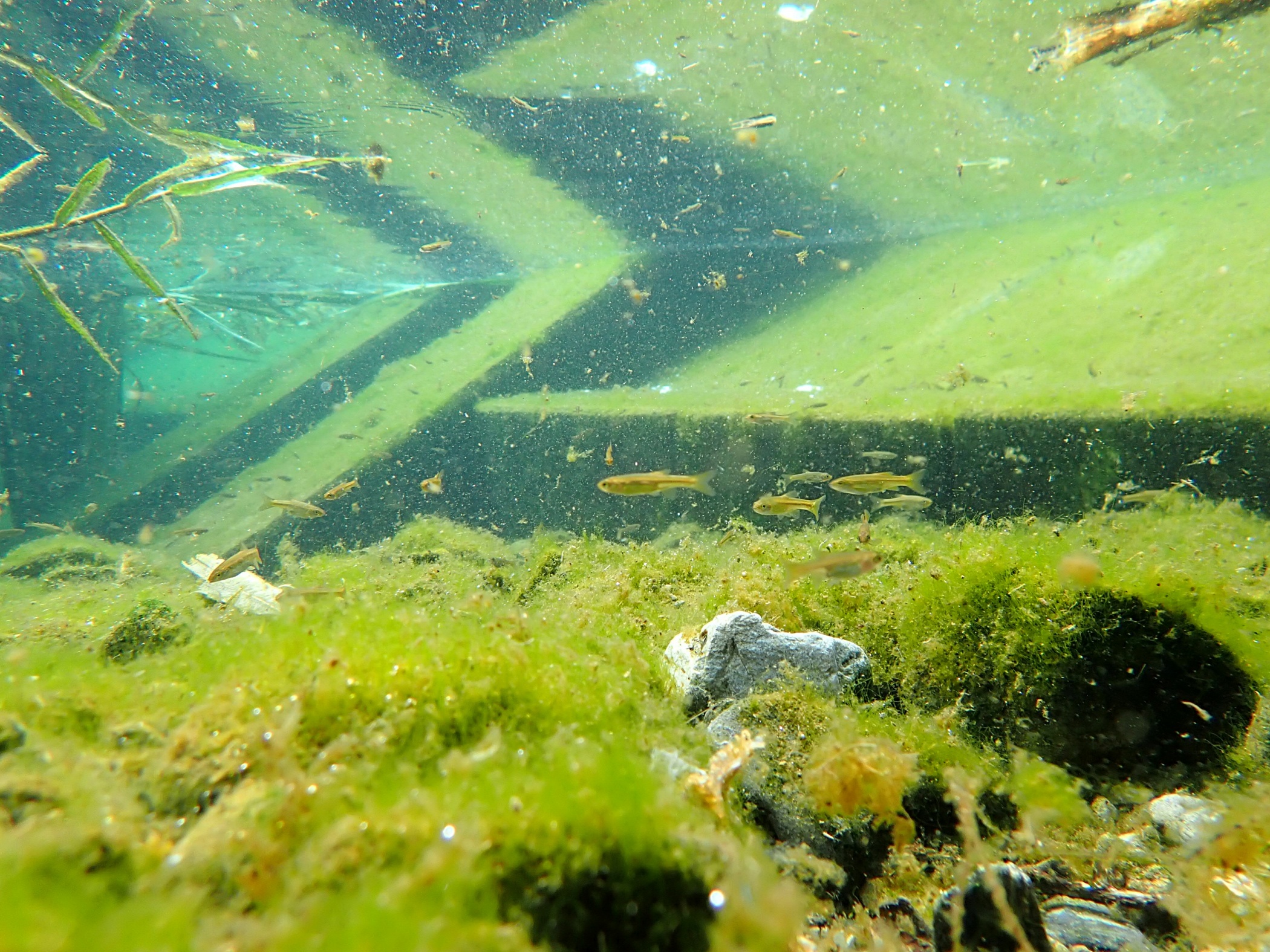 真夏の川べりは草の繁殖が凄いですが、水中も例にもれず藻が多いのが見て取れます。