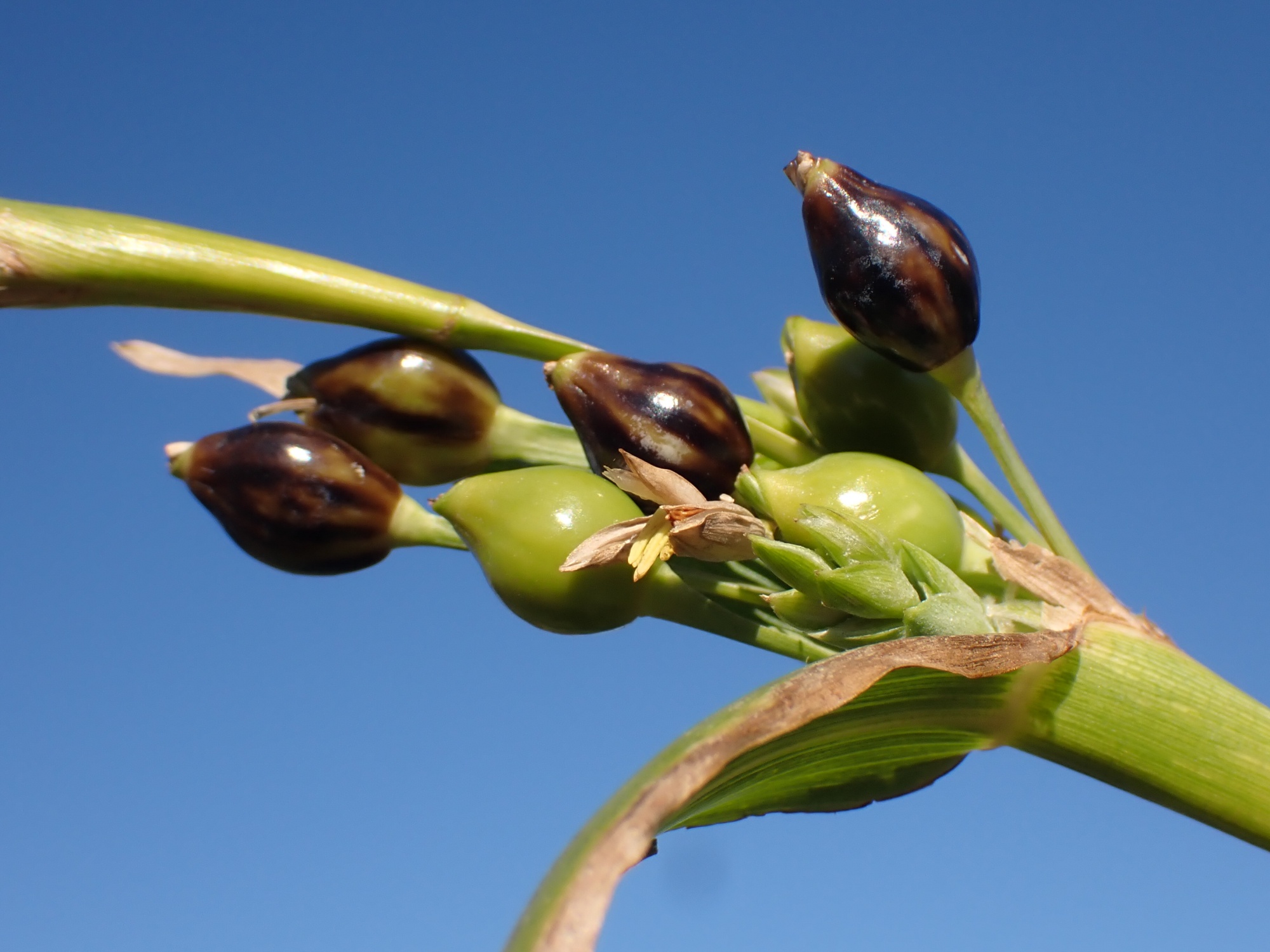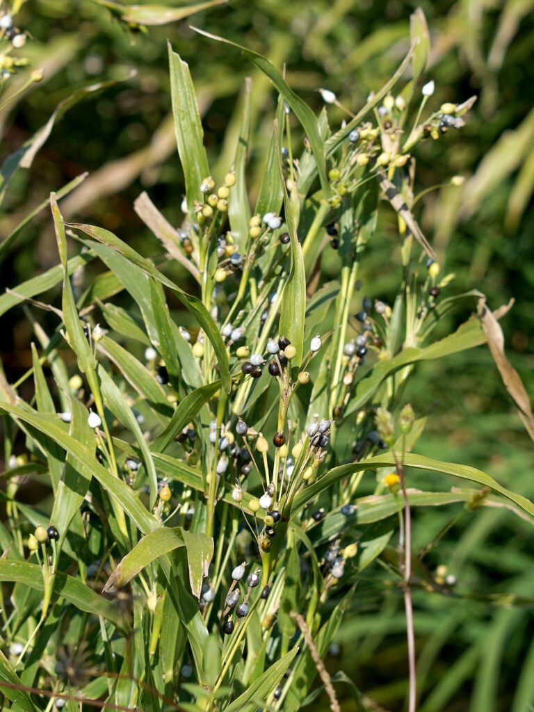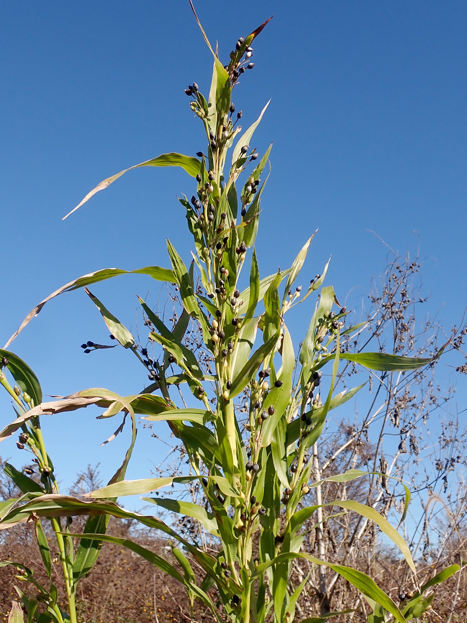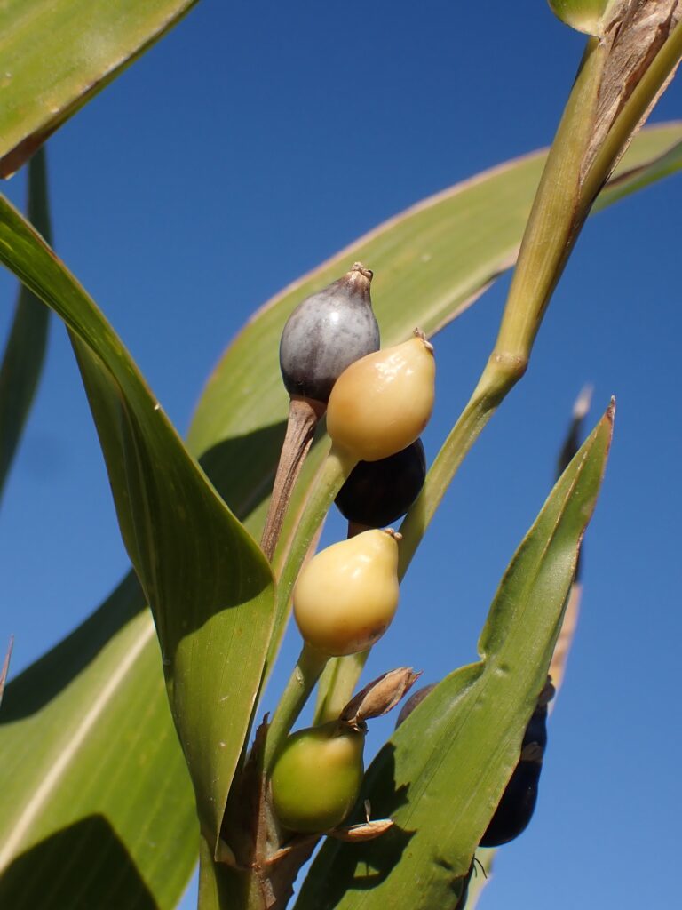 2021,2023 ジュズダマの花と実 2025年12月3日 写真 23年11月 近所の河原や水路脇で見かける数珠玉です。 雌しべの先端がハートの形に(以下21年9月) 稲のような花から実ができていく様子です(ジュズダマはイネ科)。 トンボのつがい(21年10月) 21年8月 21年8月 21年11月 以下21年11月 23年11月 真冬でもまだ熟してない緑の実が見られます。スモークブルーや艶やかな黒色の実が、冬をまたいだ長い期間楽しめます。 21年11月 (Instagramの過去投稿より)