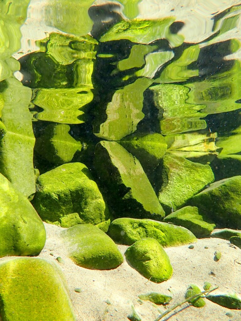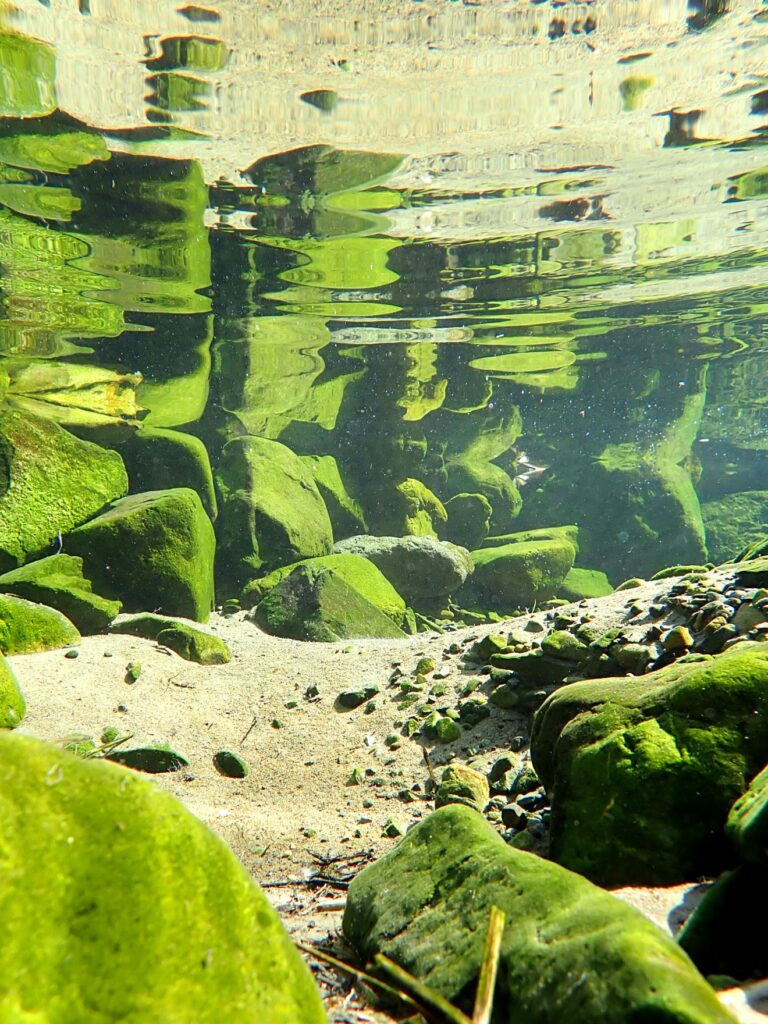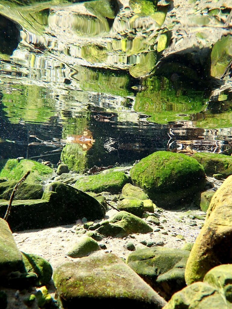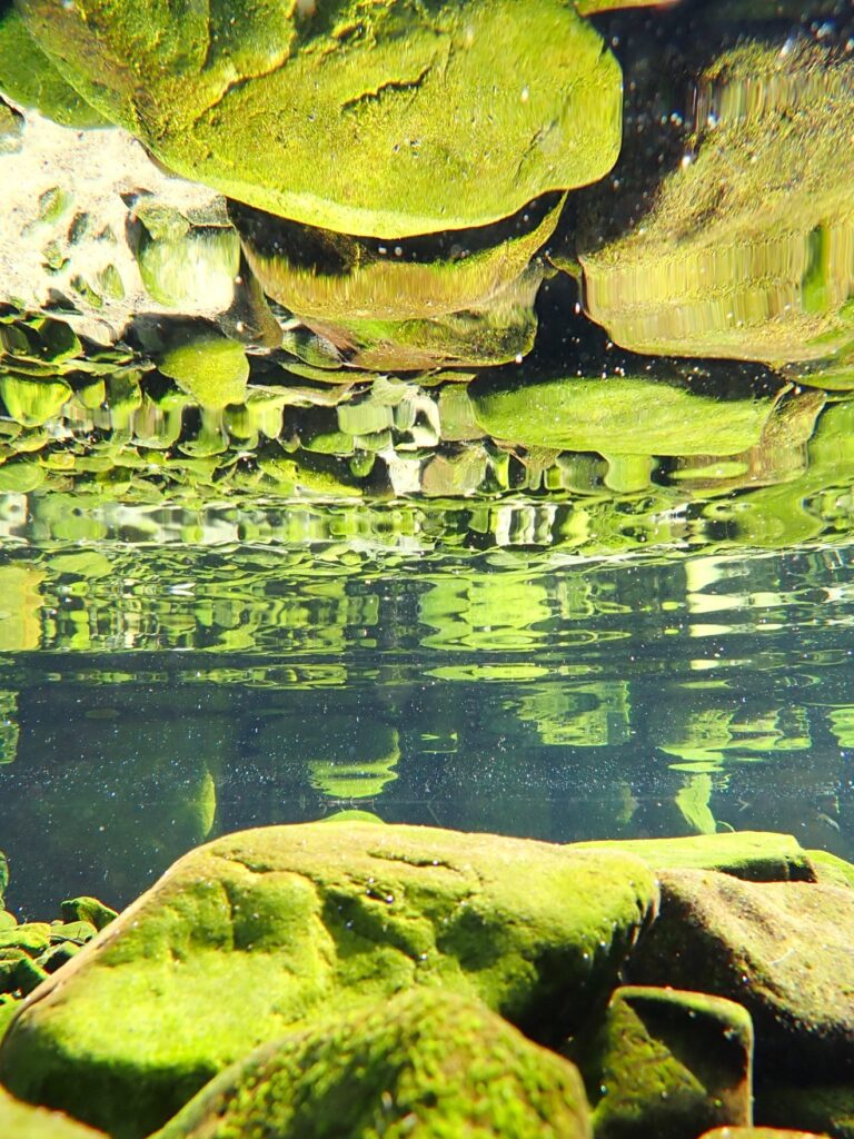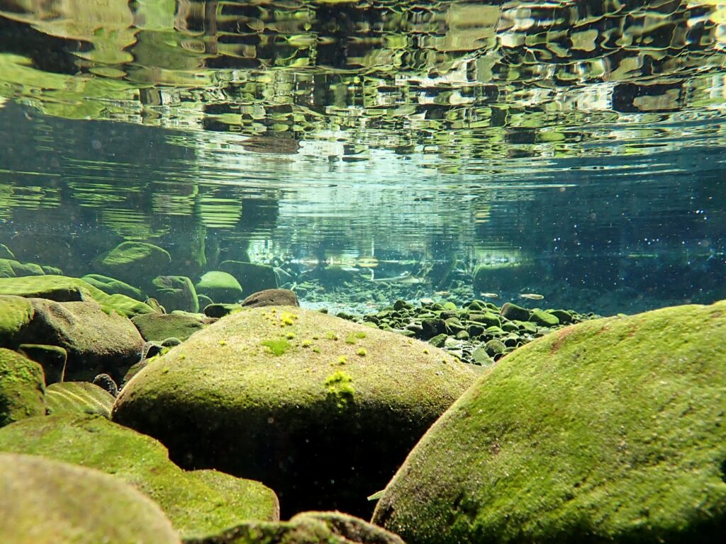 青々としたコケに覆われた大小の石が、透明度の高い水中でリフレクションして、詫び錆を感じさせます。