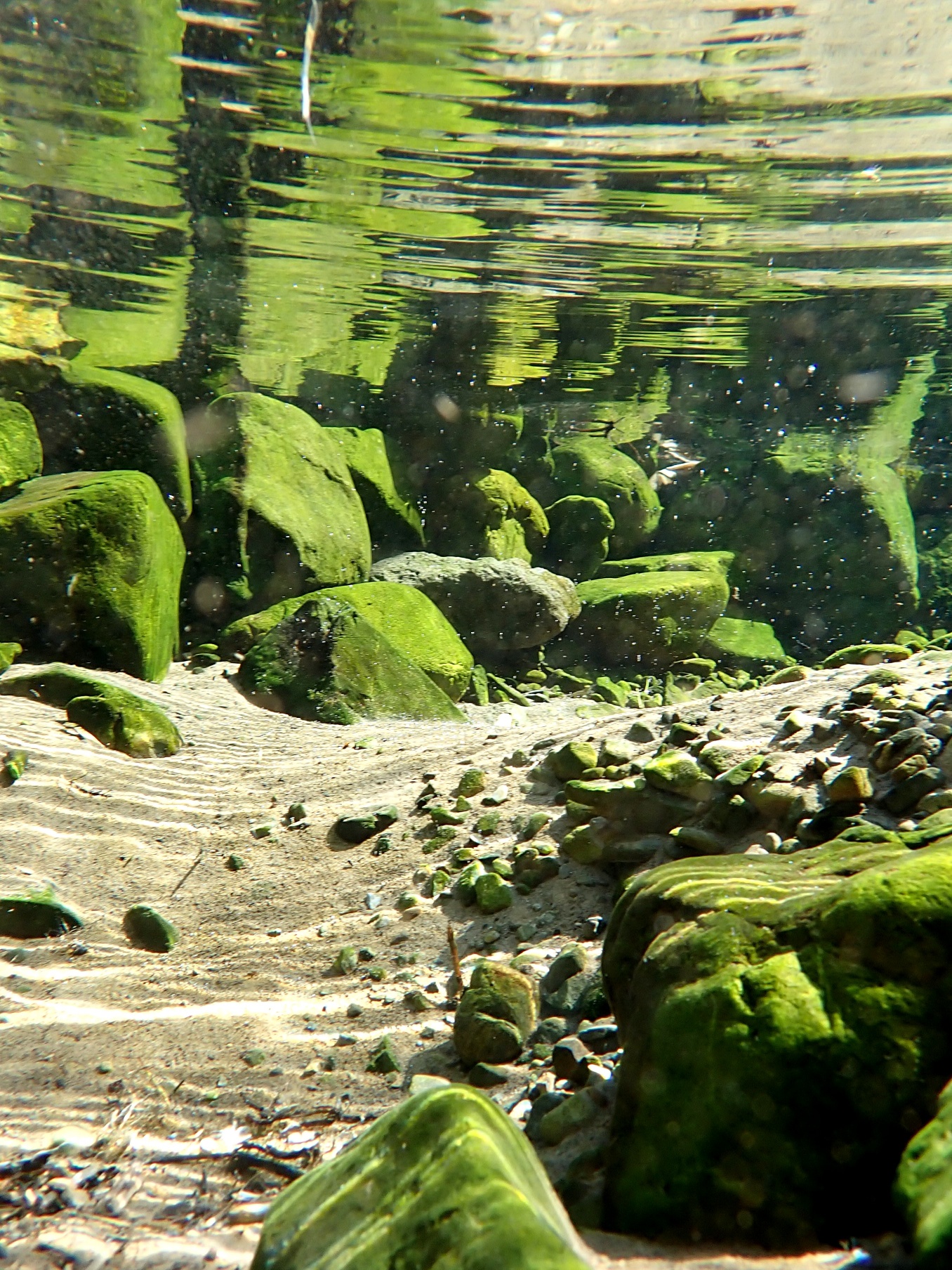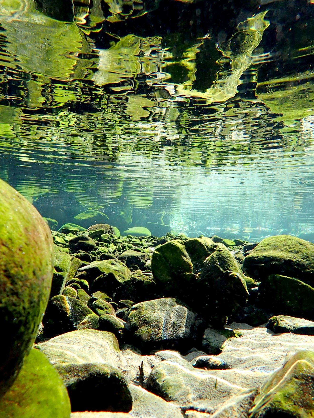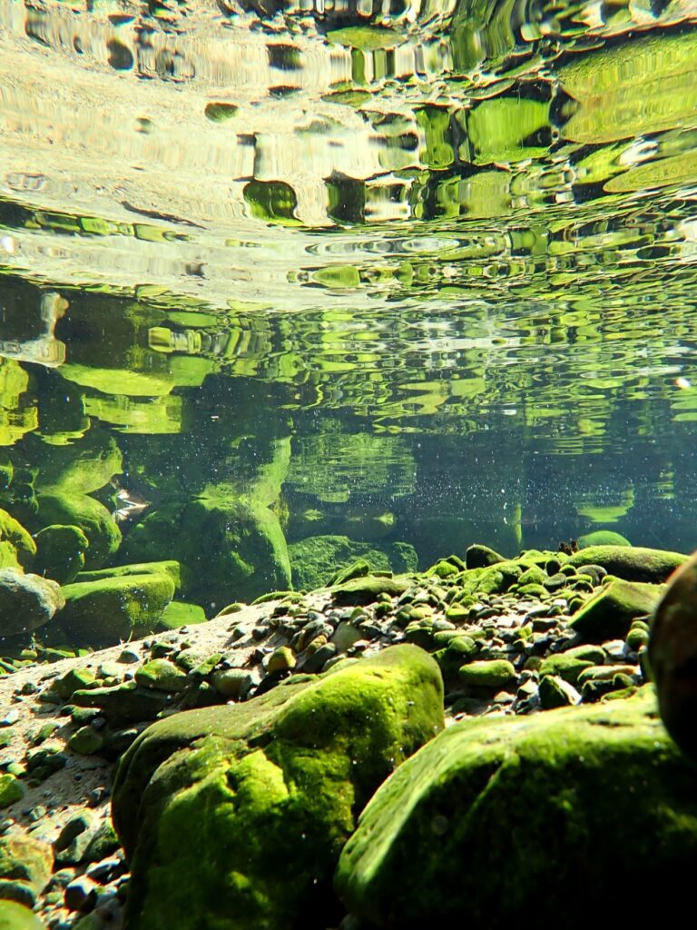 青々としたコケに覆われた大小の石が、透明度の高い水中でリフレクションして、詫び錆を感じさせます。