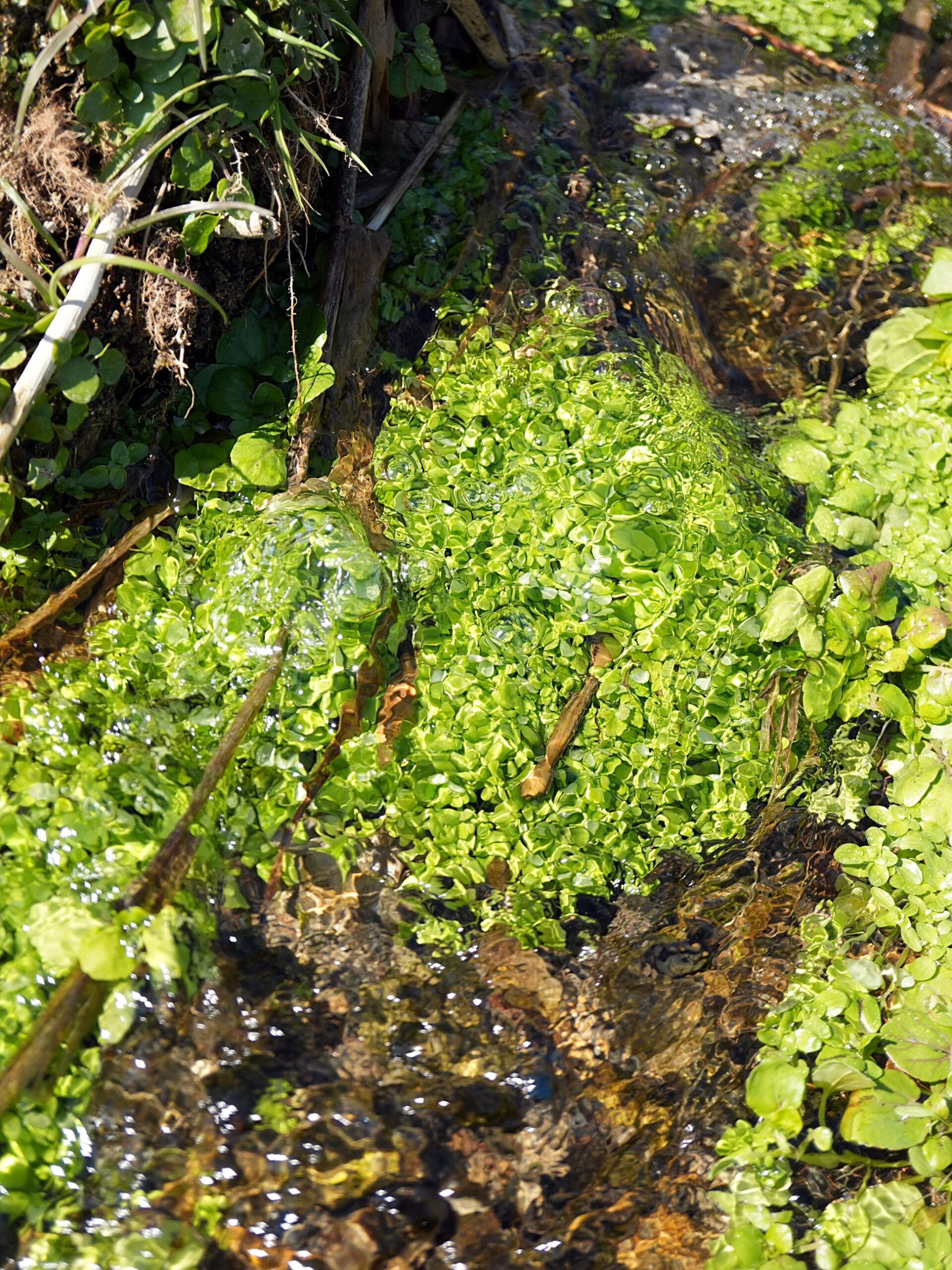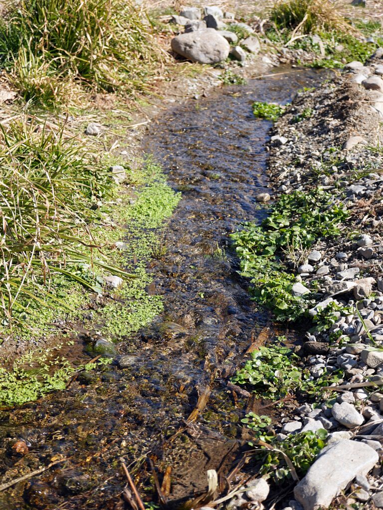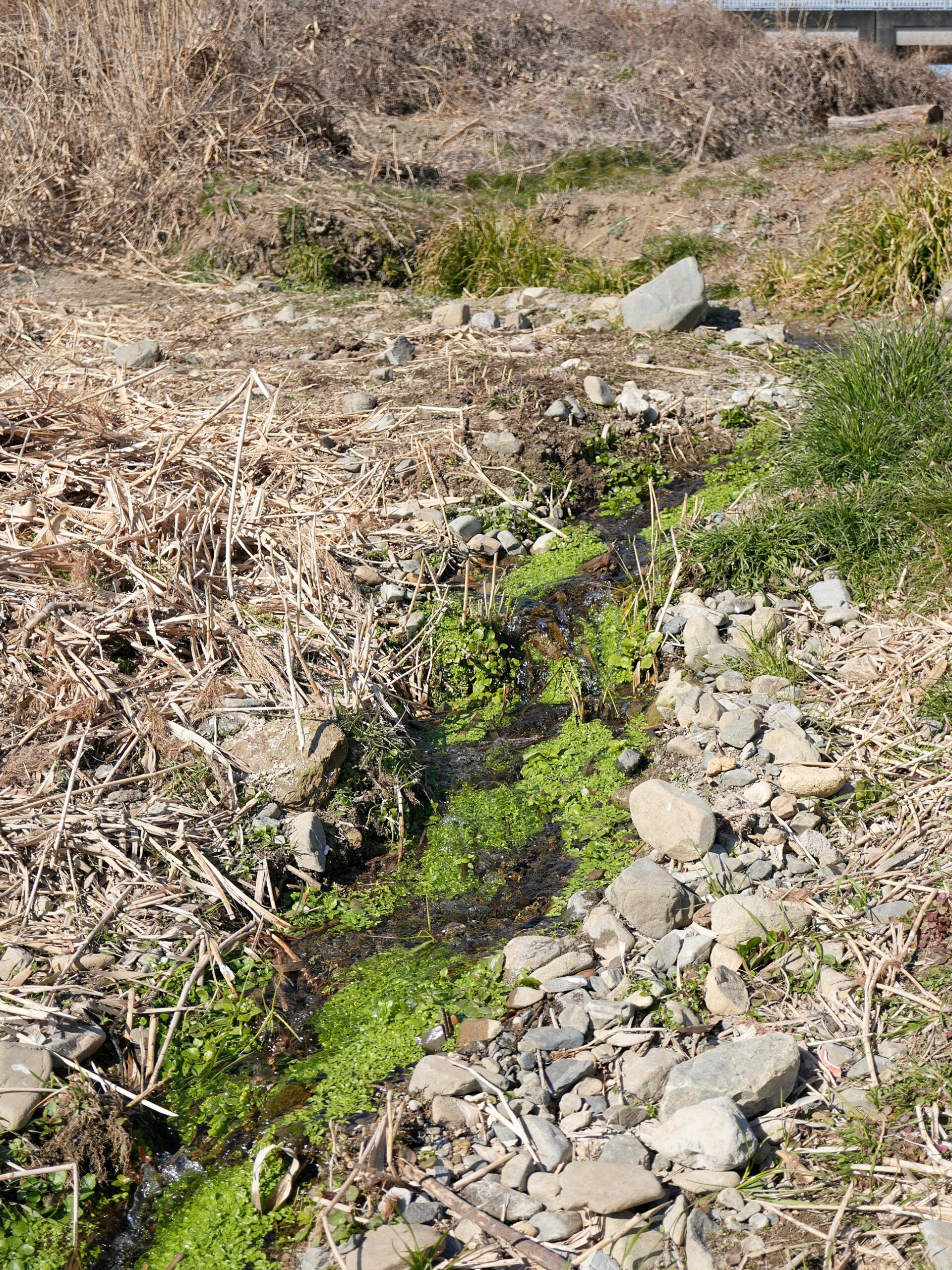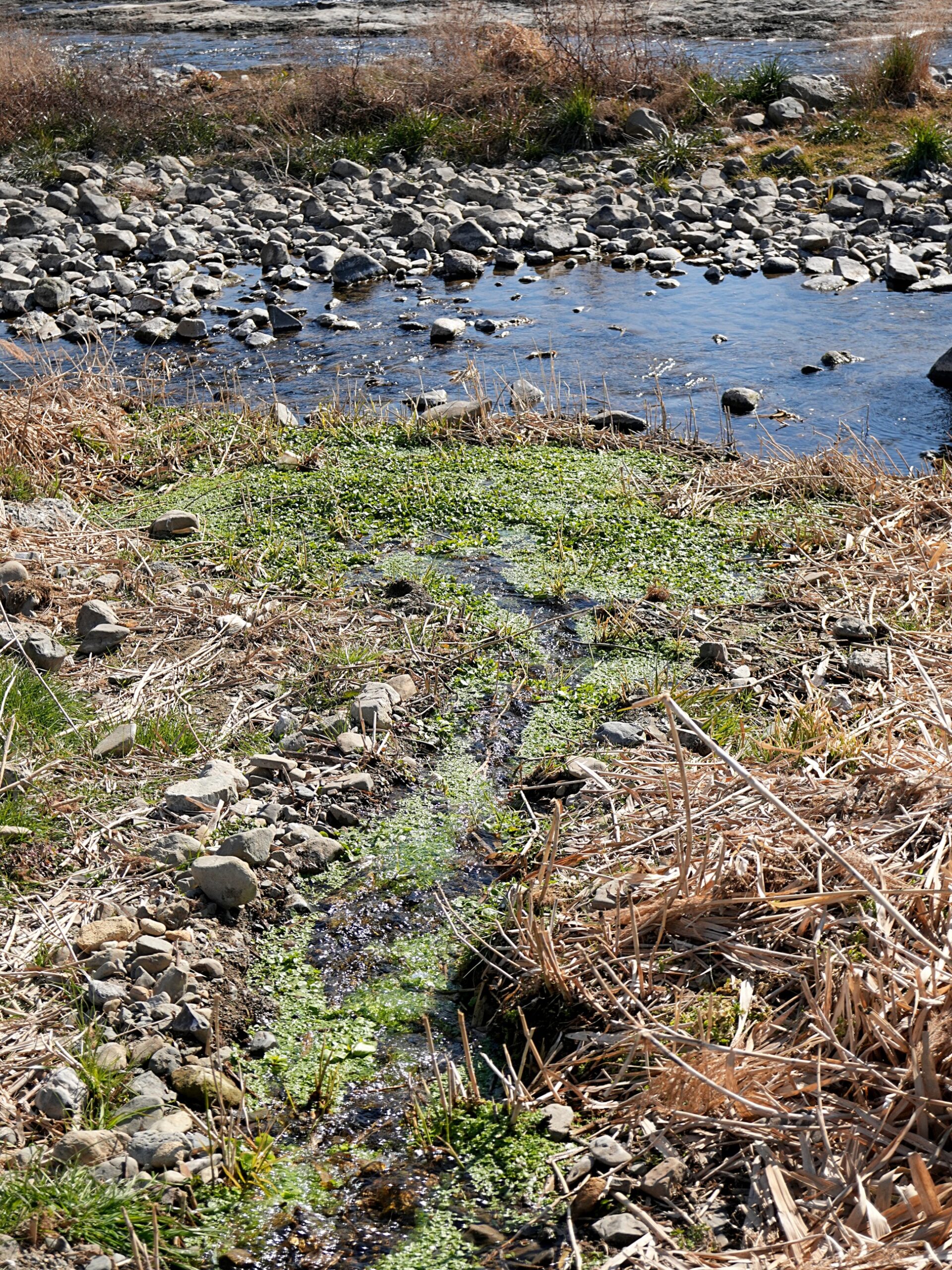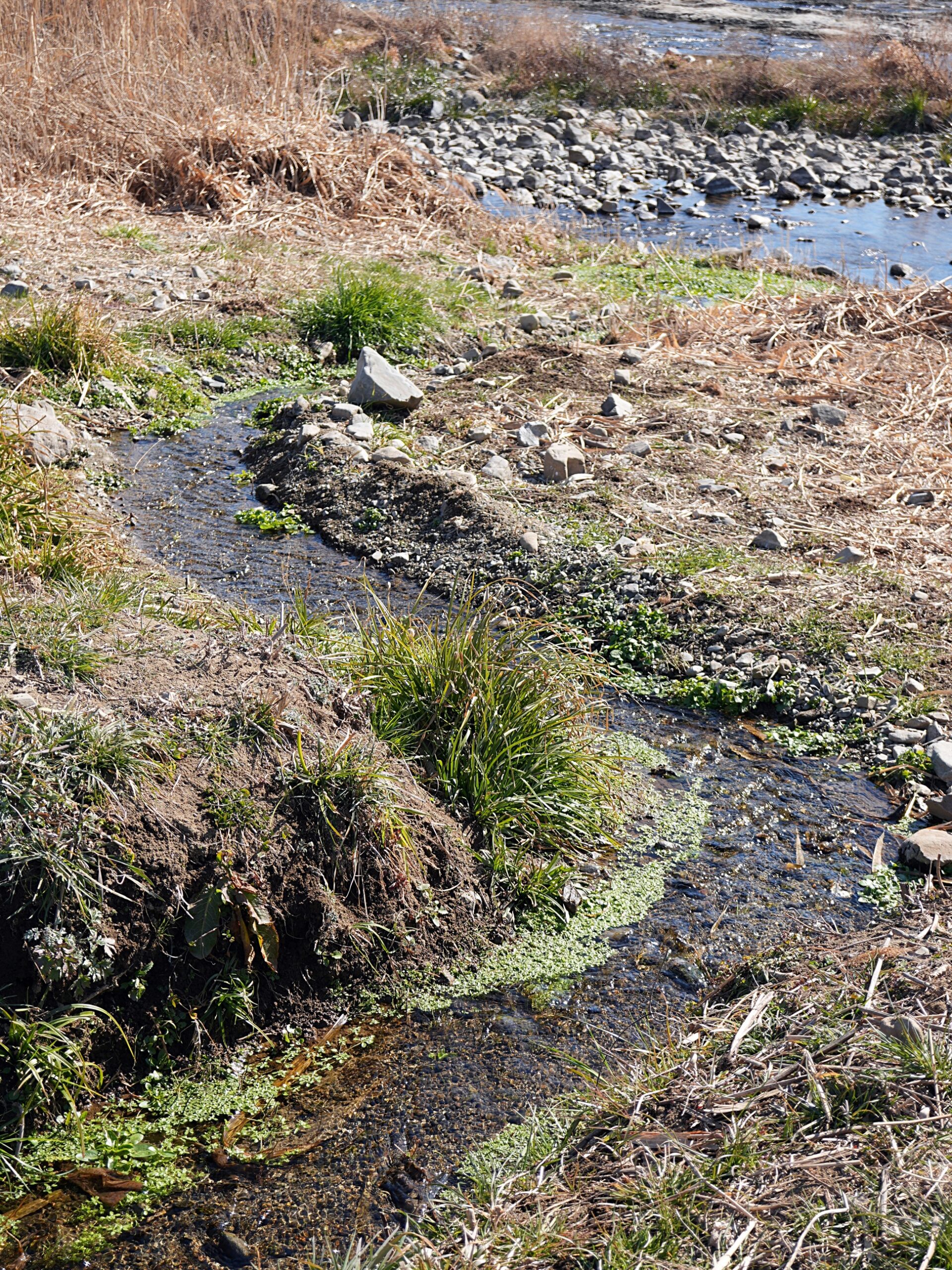本流に向かって流れだす水に沿って、青々とした草が生えているのが周囲の枯草の風景と対照的です。